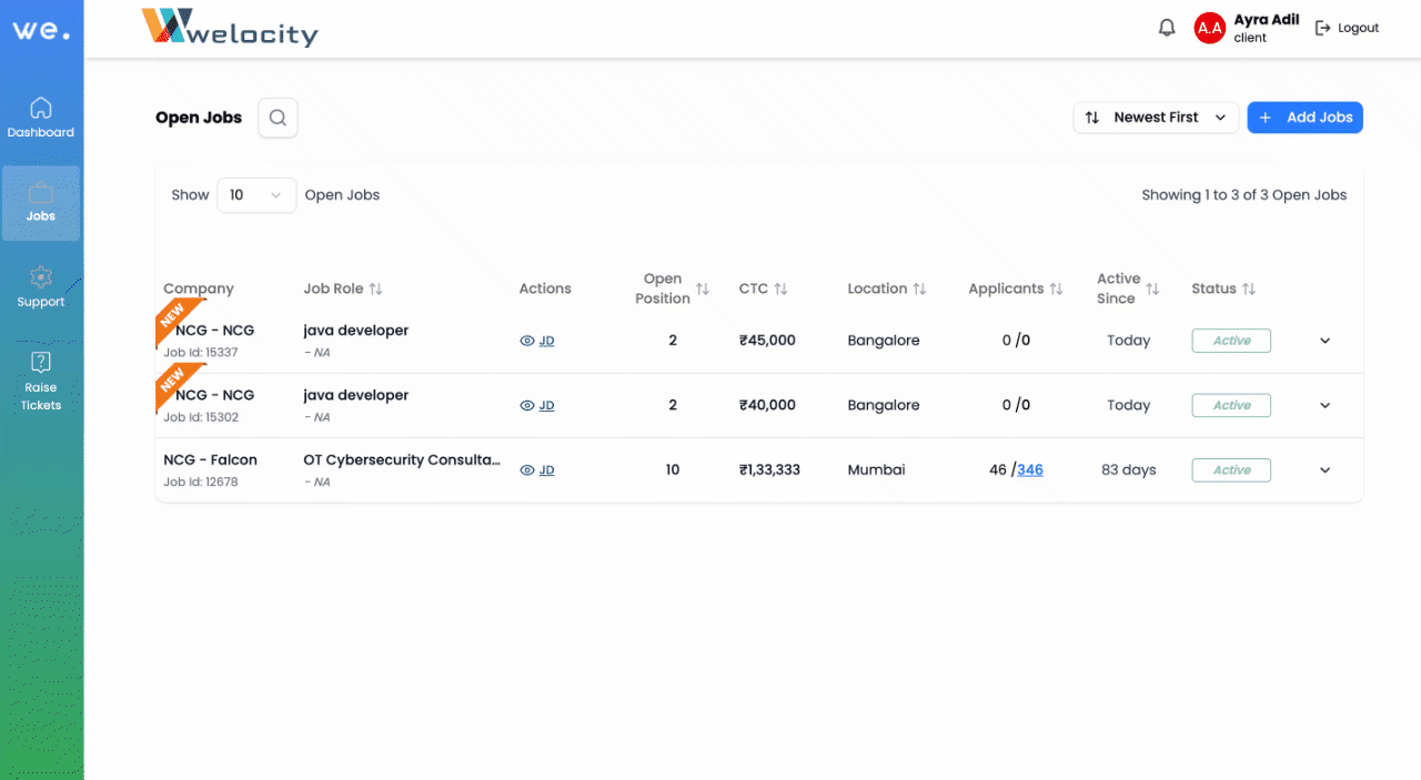 To view all job postings, start by clicking on the “Jobs” icon located just below the Dashboard. This will open a list of all available jobs. For each job, you will see key details such as the company name, job role, location, and the number of open positions for that specific role.