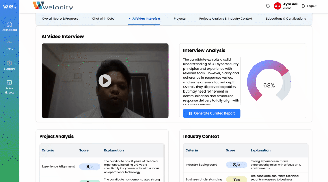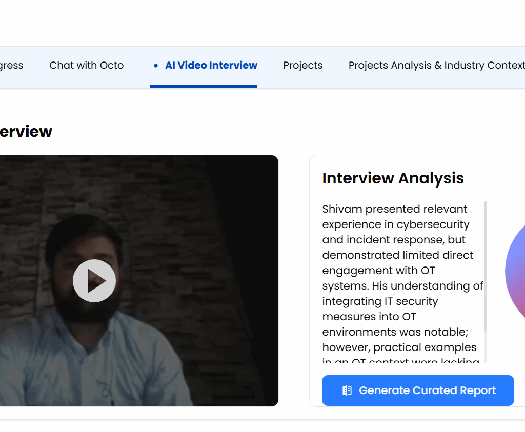 The Interview Curated Report is an AI-generated analysis of a candidate interview conducted by the AI agent, Octo. It provides a summarized and insightful view of the candidate’s performance.